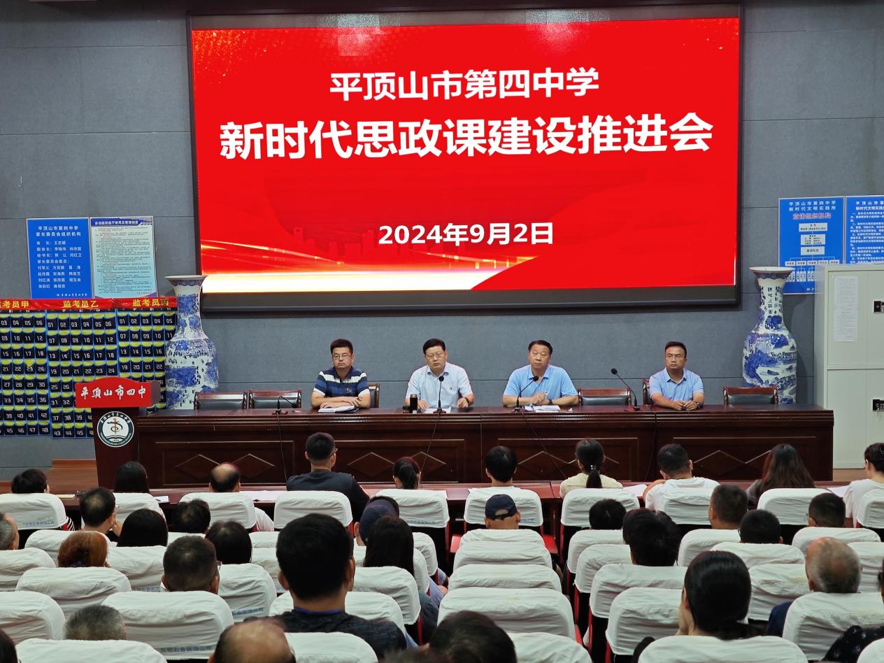 平顶山市第四中学 召开新时代思政课建设推进会发表时间:2024-09-05 14:06 平顶山市第四中学 召开新时代思政课建设推进会 9月2日下午,平顶山市第四中学新时代学校思政课建设推进会在讲座厅召开,校党总支书记、校长杨全军出席会议并讲话。 会上,杨全军传达了中央、省委和市教体局关于新时代思政课建设的相关精神,并对学校新时代思政课建设提出要求。