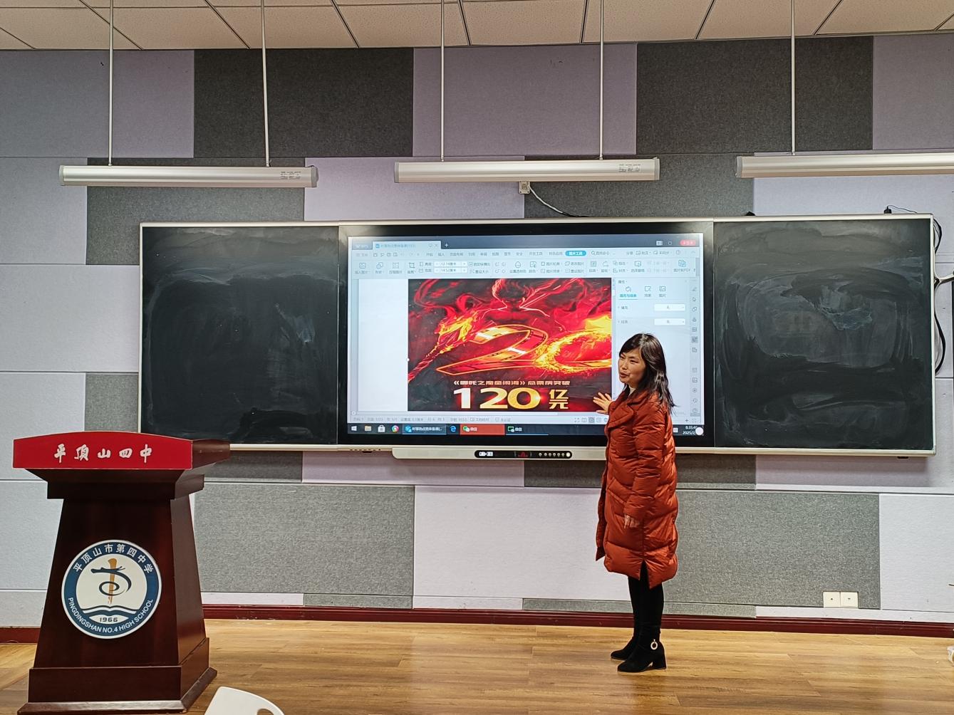 抓住思政小课堂,讲好时政大热点发表时间:2025-02-21 17:49 抓住思政小课堂,讲好时政大热点 平顶山市四中开展2025年春季思政**课集体教研活动 春节档电影《哪吒2》火爆,直至今日,票房已突破127亿,**动画电影票房**,位列全球电影总榜第8名。其不仅是中国电影工业化的重要里程碑,更是成为中国文化输出的标志性事件。为抓住这个生动的思政案例,平顶山市四中政治教研组全体教师于2025年2月20日在未来教室召开“抓住思政小课堂,讲好时政大热点”集体教研活动。