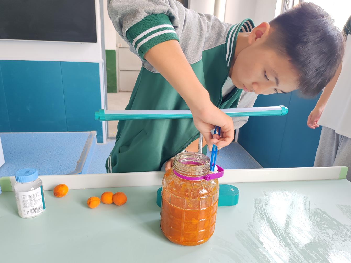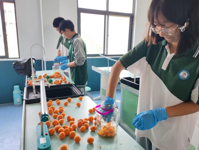 采摘结束后,同学们将杏子带回实验室,进行清洗、去核和压碎等处理。为了保证发酵效果,他们还对发酵瓶等器具进行了严格的清洗和消毒。