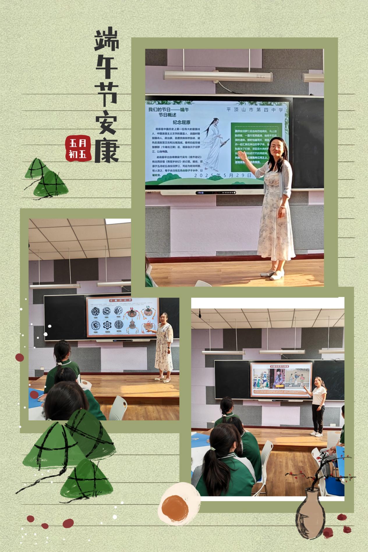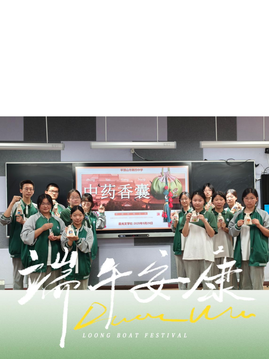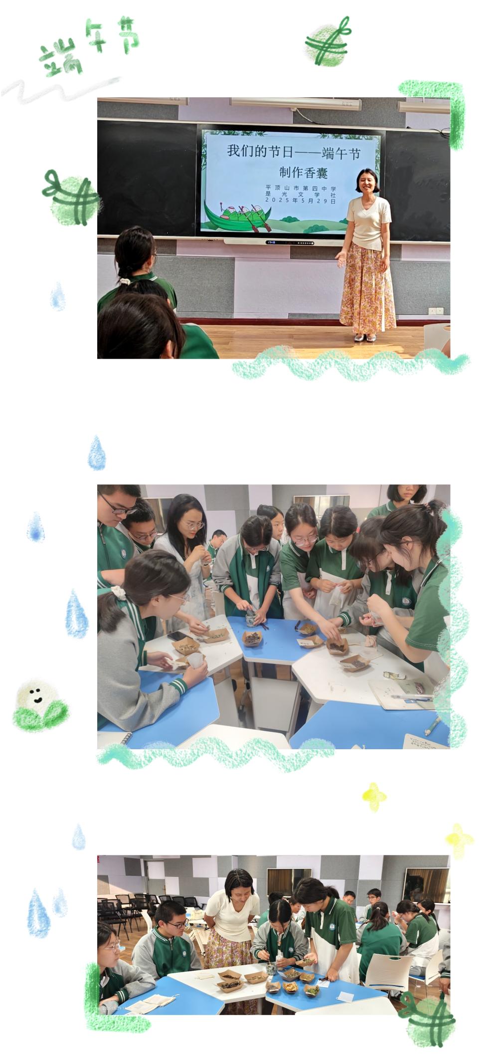 平顶山市四中是光文学社组织学生开展“我们的节日——端午”主题活动发表时间:2025-05-30 11:31 端午安康,“香”遇美好 平顶山市四中是光文学社组织学生开展“我们的节日——端午”主题活动 艾叶飘香近端阳,诗韵药香共悠长。为迎接中华民族传统节日端午节,深入感受其文化内涵,平顶山市四中是光文学社在学校团委的指导下,于2025年5月29日下午在未来教室成功举办了“我们的节日——端午”主题活动。