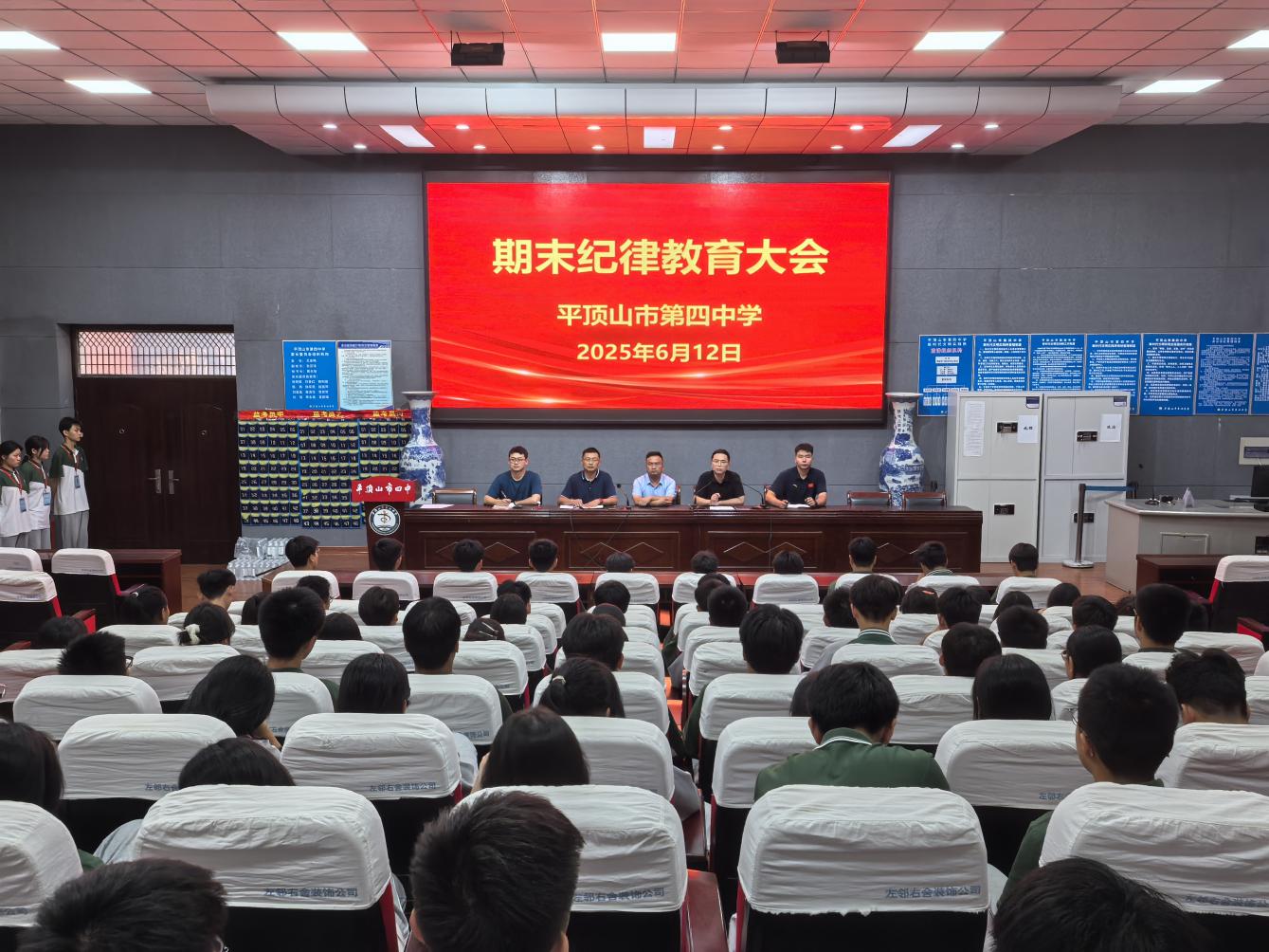 平顶山市四中召开期末纪律教育大会发表时间:2025-06-13 17:43 规范行为正学风,严明纪律迎期末 平顶山市四中召开期末纪律教育大会 为强化全体学生的纪律观念,营造风清气正、积*向上的期末备考氛围,2025年6月12日,平顶山市四中在校讲座厅召开期末纪律教育大会。副校长刘*伟,政教处、各年级部相关负责人,各班班长及部分学生代表参加会议。会议由刘*伟主持。