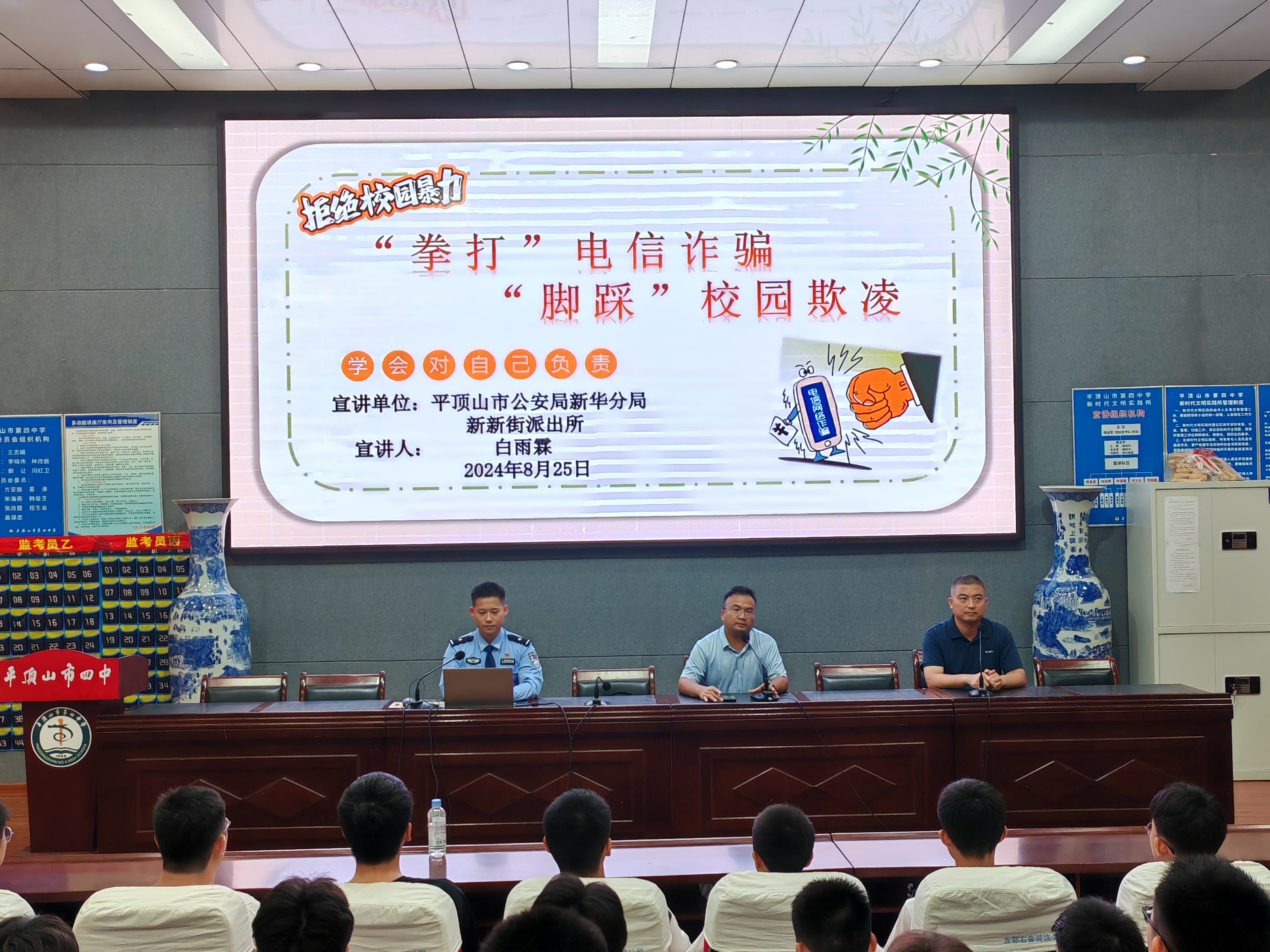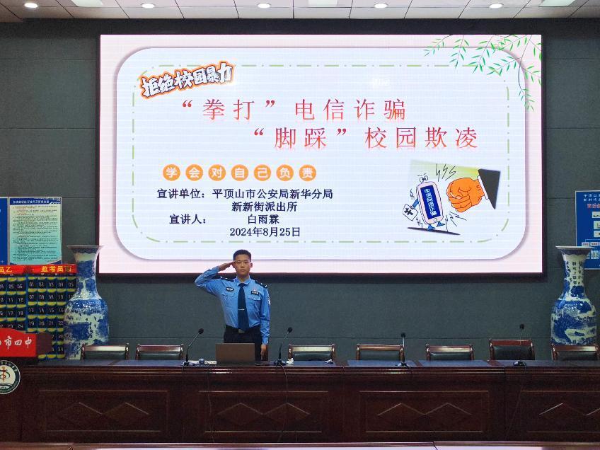 四中法制教育发表时间:2024-08-26 18:55 增强守法意识 建设平安校园 平顶山市四中举办2024级高一新生法制安全教育讲座 为深入开展青少年法制教育,增强学生法制观念和守法意识,营造良好的校园安全环境,8月25日下午,平顶山市四中特邀平顶山市公安局新华分局新新街派出所警官、市四中驻校民警兼法制辅导员白雨霖,为2024级高一新生作题为“学会对自己负责”的法制教育专题讲座。